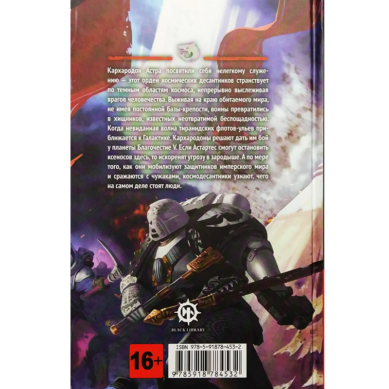 Кархародон Астра посвятили себя нелегкому служению - этот орден космических десантников странствует по темным областям космоса, непрерывно выслеживая врагов человечества. Выживая на краю обитаемого мира, не имея постоянной базы-крепости, воины превратились в хищников, известных неотвратимой беспощадностью. Когда невиданная волна тиранидских флотов-ульев приближается к Галактике, Кархародоны решают дать им бой у планеты Благочестие V. Если Астартес смогут остановить ксеносов здесь, то искоренят угрозу в зародыше. А по мере того, как они мобилизуют защитников имперского мира и сражаются с чужаками, космодесантники узнают, чего на самом деле стоят люди.