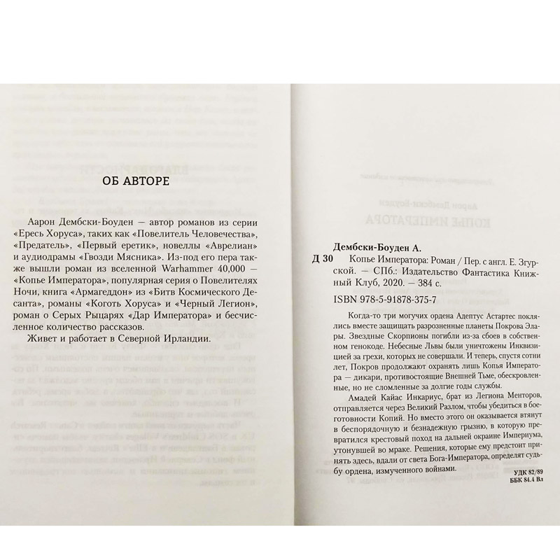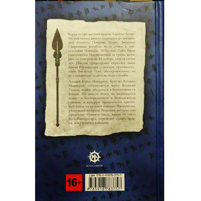 Когда-то три могучих ордена Адептус Астартес поклялись вместе защищать разрозненные планеты Покрова Элары. Звездные Скорпионы погибли из-за сбоев в собственном генокоде. Небесные Львы были уничтожены Инквизицией за грехи, которых не совершали. И теперь, спустя сотни лет, Покров продолжают охранять лишь Копья Императора - дикари, противостоящие Внешней Тьме, обескровленные, но не сломленные за долгие годы службы. Амадей Кайас Инкариус, брат из Легиона Менторов, отправляется через Великий Разлом, чтобы убедиться в боеготовности Копий. Но вместо этого он оказывается втянут в беспоряд очную и безнадежную грызню, в которую превратился крестовый поход на дальней окраине Империума, утонувшей во мраке. Решения, которые ему предстоит принять здесь, вдали от света Бога-Императора, определят судьбу ордена, измученного войнами.