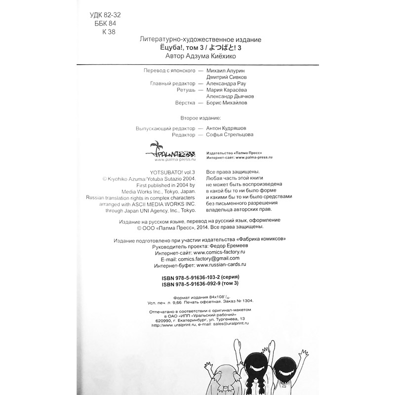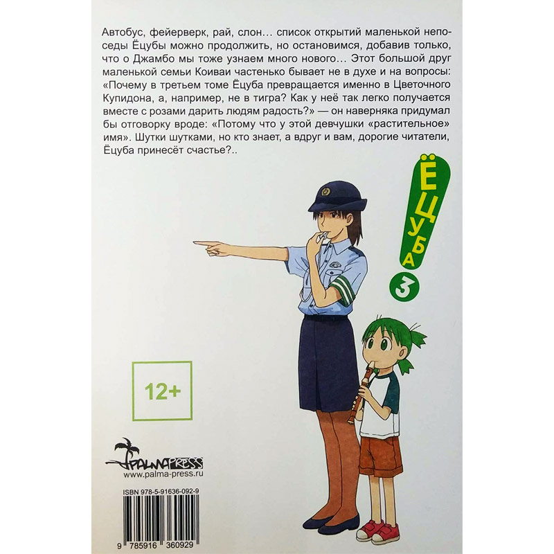 Автобус, фейерверк, рай, слон... список открытий маленькой непоседы Ецубы можно продолжить, но остановимся, добавив только, что о Джамбо мы тоже узнаем много нового... Этот большой друг маленькой семьи Коиваи частенько бывает не в духе и на вопросы: "Почему в третьем томе Ецуба превращается именно в Цветочного Купидона, а, например, не в тигра? Как у нее так легко получается вместе с розами дарить людям радость?" – он наверняка придумал бы отговорку вроде: "Потому что у этой девчушки "растительное" имя". Шутки шутками, но кто знает, а вдруг и вам, дорогие читатели, Ецуба принесет счастье?
