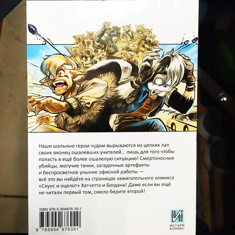 Наши шальные герои чудом вырываются из цепких лап своих вконец ошалевших учителей, лишь для того чтобы попасть в еще более ошалелую ситуацию! Смертоносные ниндзя, могучие танки, загадочные артефакты и беспросветное уныние офисной работы: всё это вы найдёте на страницах нового тома «Скунс и Оцелот» от Хатчетта и Богдана! Даже если вы ещё не прочли первый том, это не повод не прикупить второй!
